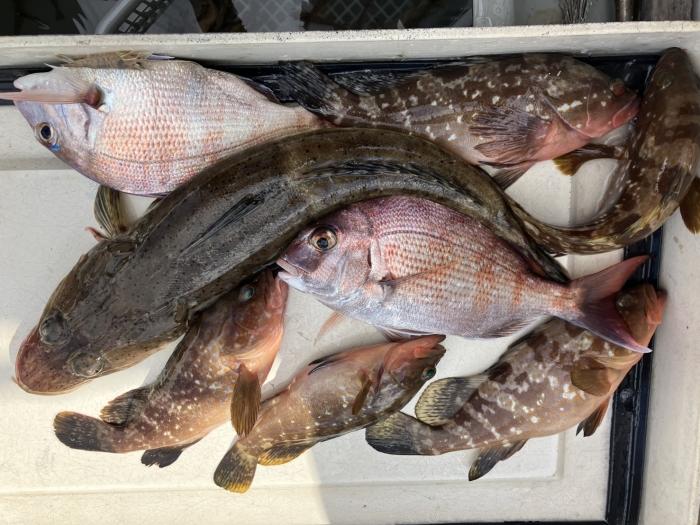 島かげの30~15mの駆け上がりを流すと、小型のアコウやタイがポロポロ釣れた。